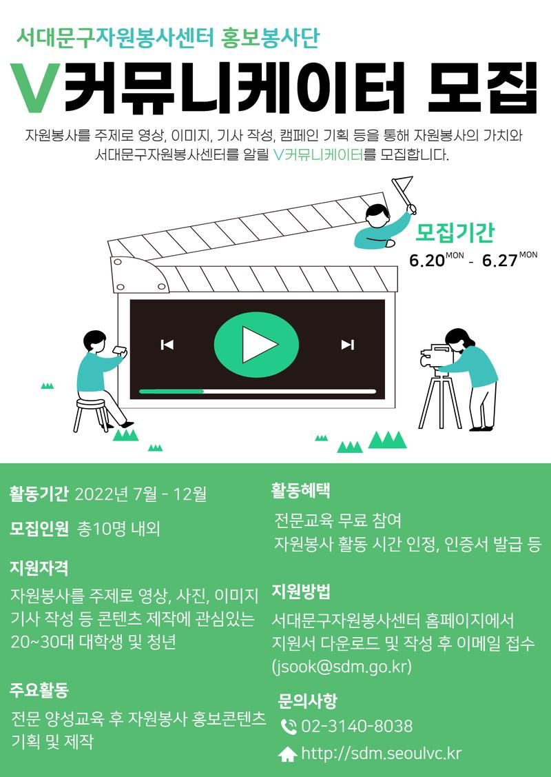서대문구자원봉사센터는 자원봉사를 주제로 영상, 이미지 등 홍보 콘텐츠를 제작하여 자원봉사의 가치와 자원봉사센터를 알리는 홍보봉사단을 모집하고자 합니다.
