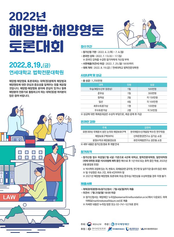해양수산부가 주최하고 한국해양재단이 주관하는 2022년 해양법·해양영토 토론대회를 다음과 같이 개최하오니 많은 관심과 참여 바랍니다.