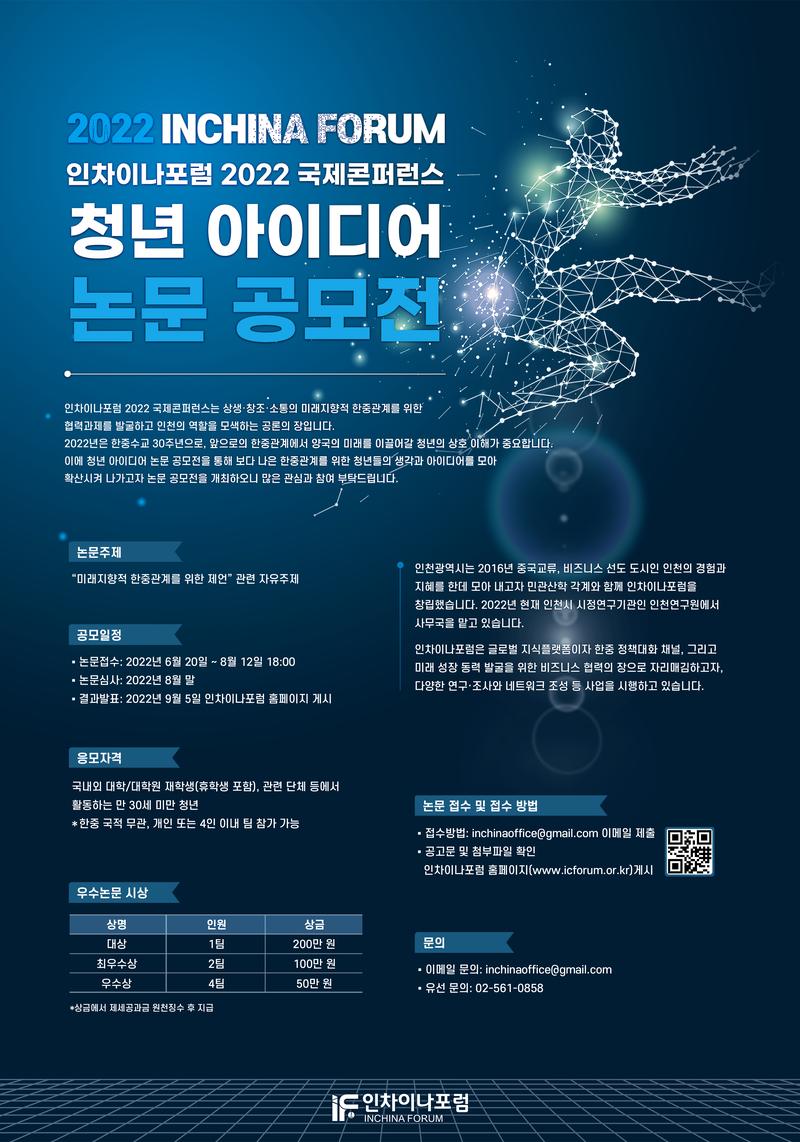 인차이나포럼 2022 국제콘퍼런스는 상생·창조·소통의 미래지향적 한중관계를 위한 협력과제를 발굴하고 인천의 역할을 모색하는 공론의 장입니다. 인천연구원에서는 미래의 한중관계를 이끌어나갈 청년들의 상호이해를 넓히고 더 나은 한중관계를 위한 청년들의 생각과 아이디어를 모아 확산시키고자 다음과 같이 논문 공모전을 개최하오니 많은 관심과 참여 부탁드립니다.