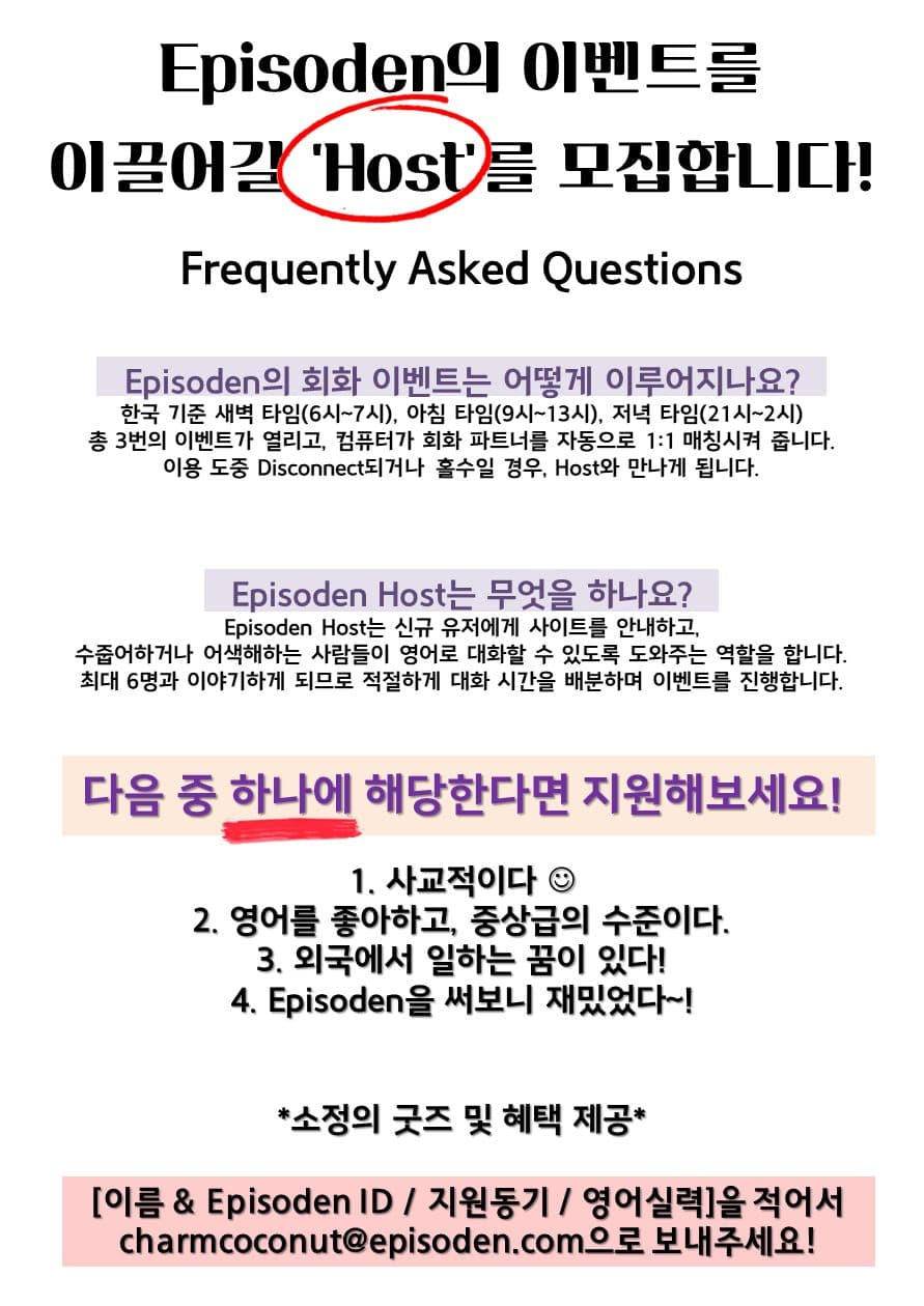 Episoden Host는 신규 유저에게 사이트를 안내하고, 수줍어하거나 어색해하는 사람들이 영어로 대화할 수 있도록 도와주는 역할을 합니다. 최대 6명과 이야기하게 되므로 적절하게 대화 시간을 배분하며 이벤트를 진행합니다.