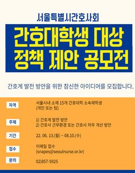 - 간호계 미래를 이끌어 나갈 간호대학생들을 대상으로 간호계 현안에 대한 관심을 유도하고 간호대학생들의 다양하고 참신한 정책 제안을 통해 간호계 발전 방안을 모색하기 위함