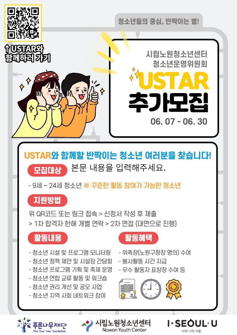 작년에 여성가족부에서🏅 최우수상🏅을 수상한 USTAR의 명예를 같이 이어나가 오직 청소년들을 위한 다양한 활동을만들어나갈 열정 뿜뿜 넘치는 청소년 분들!! 다양한 뿌듯한 경험을 할 수 있습니다. 내 의견이 실천이 되는 청소년운영위원회 모두모두 신청해주세요!!