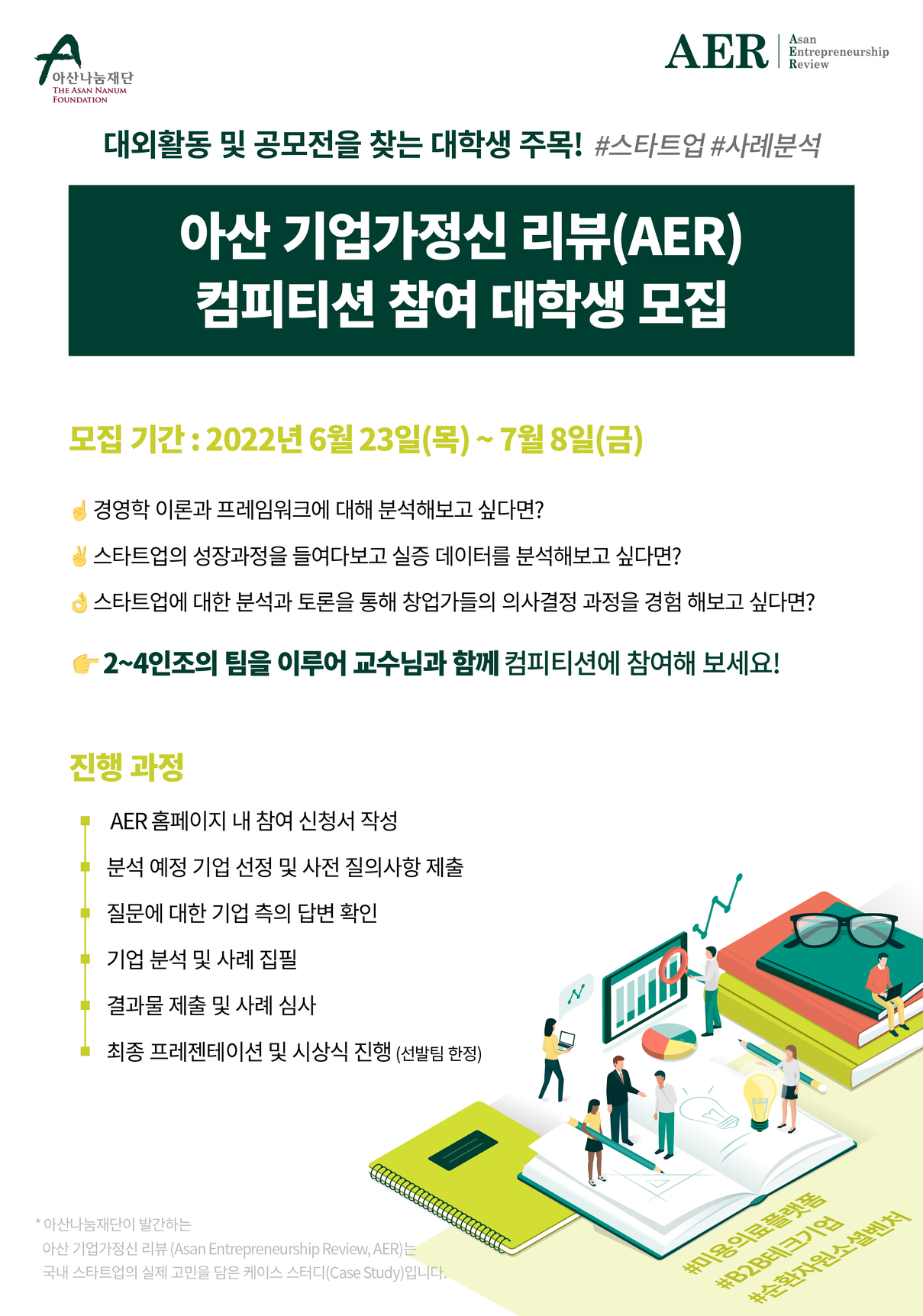 2022년부터 시작하는 “AER 대학생 컴피티션”은 그간 발행된 60여개의 AER 사례 중, 3개의 사례 대상 스타트업을 선정하여 기업들이 겪은 문제에 대해, 대학생들의 새로운 시야로 접근하고 교수님과 팀을 이뤄 분석해 보는 케이스 스터디 컴피티션입니다.