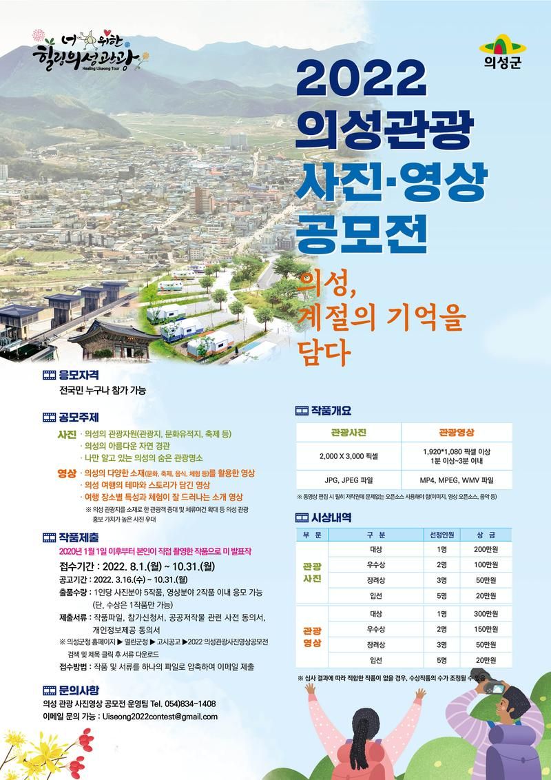 경쟁력을 갖추고자 아래와 같이 2022 의성관광 사진·영상 공모전을 개최하니 많은 참여 부탁드립니다.