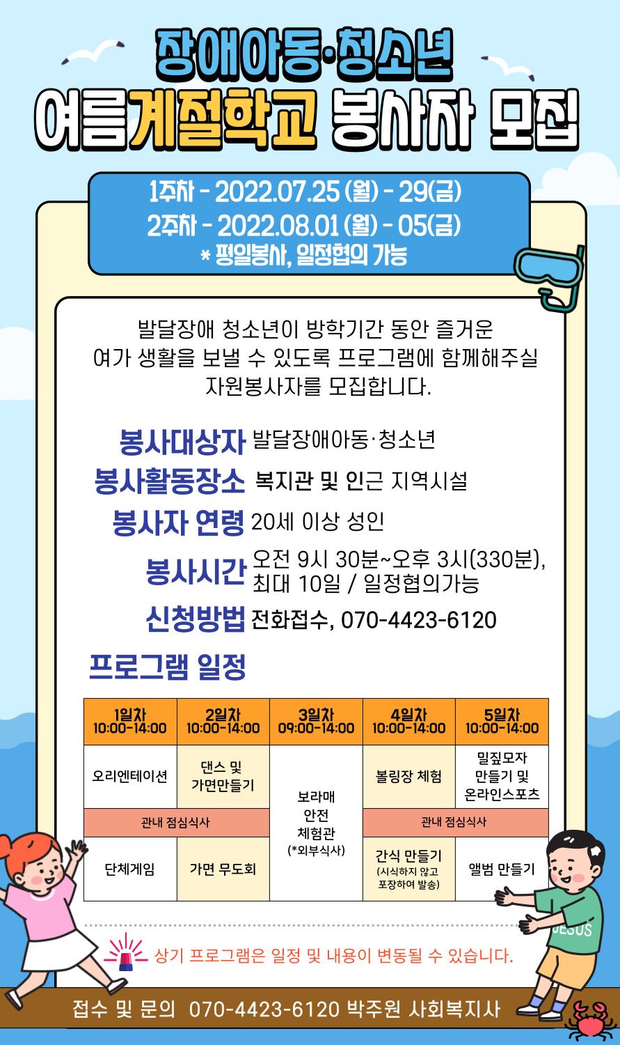 발달장애 청소년이 방학기간 동안 즐거운 여가 생활을 보낼 수 있도록 프로그램에 함께할 자원봉사자를 모집합니다.
