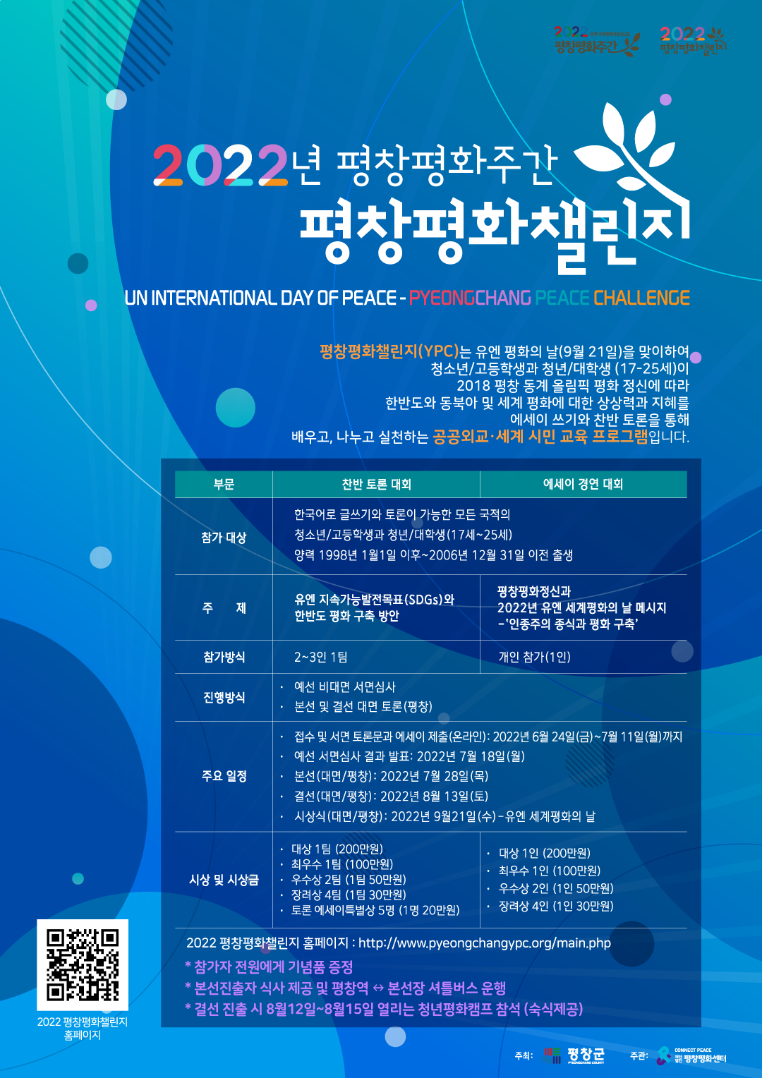 ※ 찬반토론 대회, 에세이 경연대회의 대상, 최우수상, 우수상 시상자는 세계 평화의 날 기념식 참가 및 평창평화포럼 초청