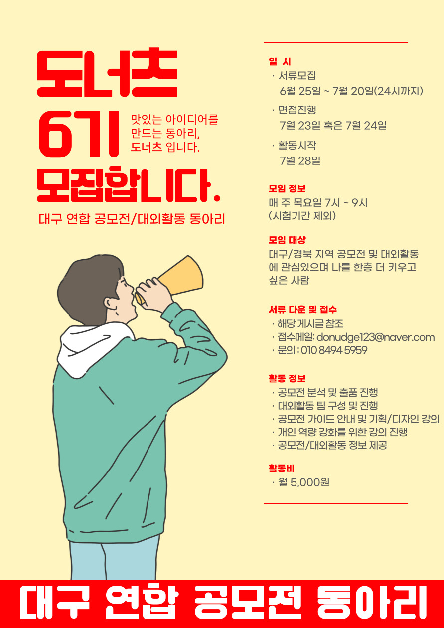이번 도너츠 역시도 새로운 뜻으로 더 좋은 콘텐츠로 새로운 기수분들을 맞이할 예정인데요. 대구 경북 지역에서 공모전 및 대외활동 그게 아니더라도 자신을 한 단계 성장시키시고 싶은 분들이라면 이번 기회에 도너츠에 함께해보시는 것은 어떨까요?