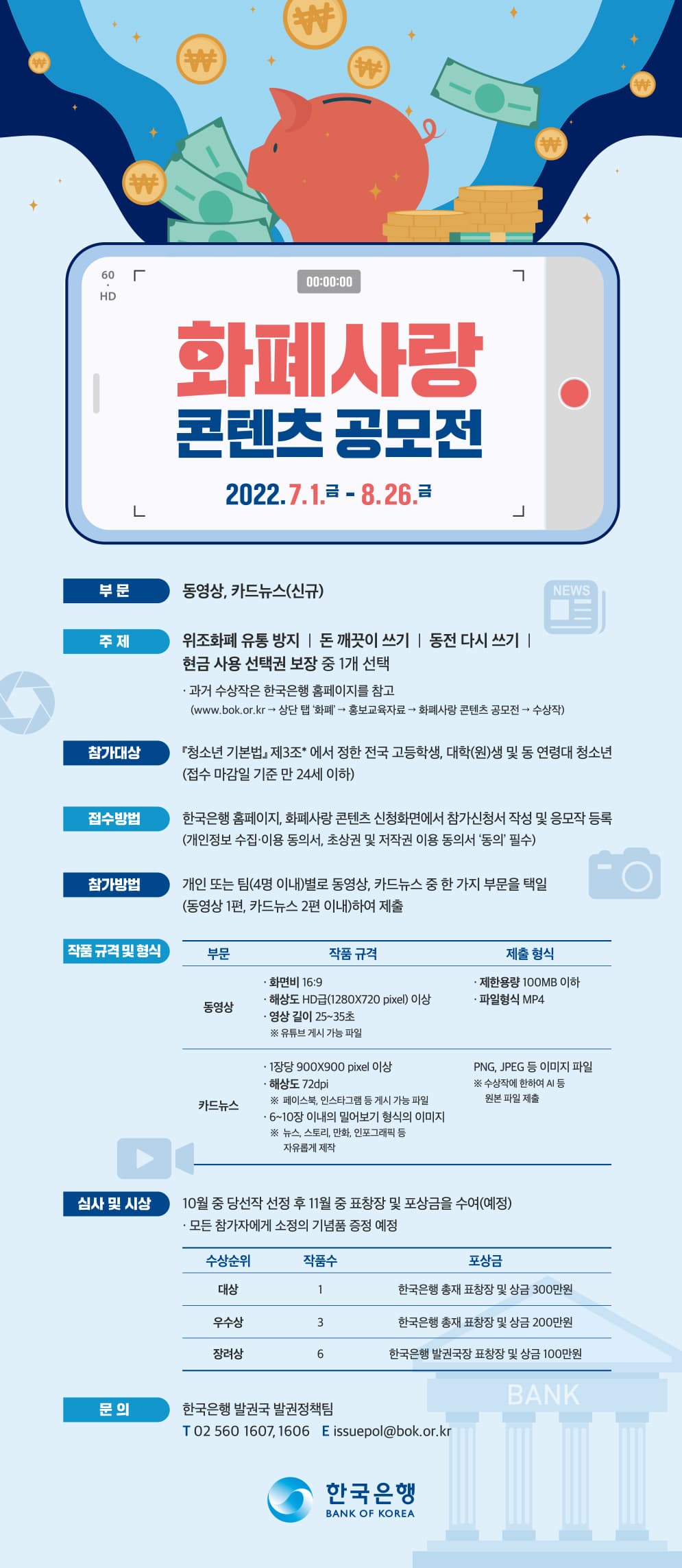 - 과거 수상작은 한국은행 홈페이지(http://www.bok.or.kr → 상단 탭 ‘화폐’ → 홍보교육자료 → 화폐사랑 콘텐츠 공모전 → 수상작)를 참조