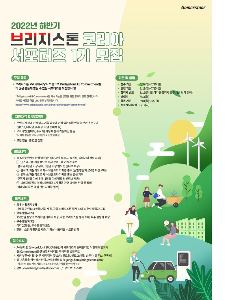브리지스톤 코리아에서 당사 브랜드와 E8 Commitment를 더 많은 분들께 알릴 수 있는 서포터즈를 모집합니다!