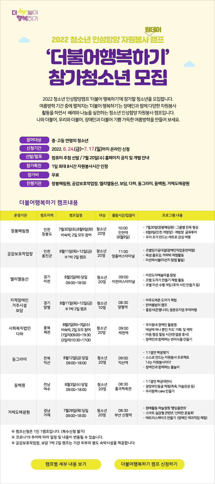 여름방학 기간 중에 펼쳐지는 '더불어행복하기'는 장애인과 함께 다양한 자원봉사 활동을 하면서 배려와 나눔을 실천하는 청소년 인성함양 자원봉사 캠프입니다. 나와 더불어, 우리와 더불어, 장애인과 더불어 기쁨 가득한 여름방학을 만들어 보세요.