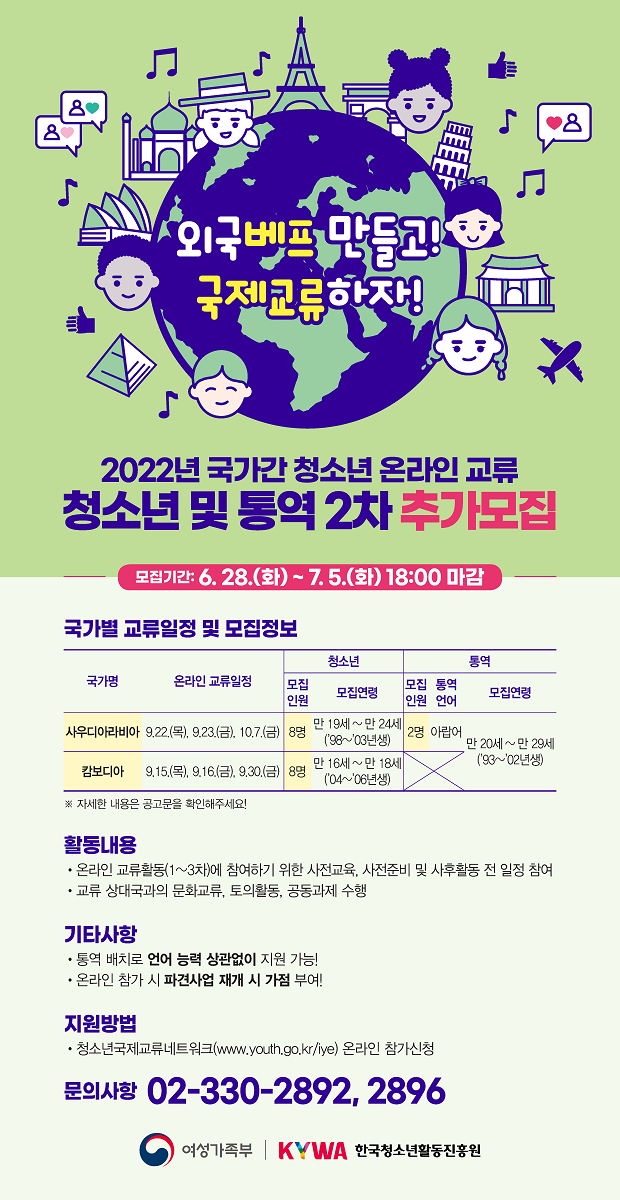 2022년 국가간 청소년 온라인 교류 청소년(대학생 포함) 및 통역 2차 추가모집