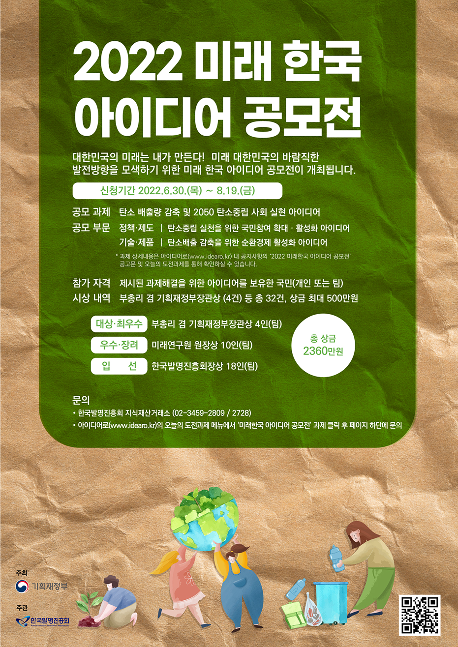 급격한 경제‧사회 구조 변화 속에서 미래 대한민국의 바람직한 발전방향에 대하여 국민들과 같이 고민하는 기회를 마련하기 위한 2022년도 미래 한국 아이디어 공모전이 개최됩니다.