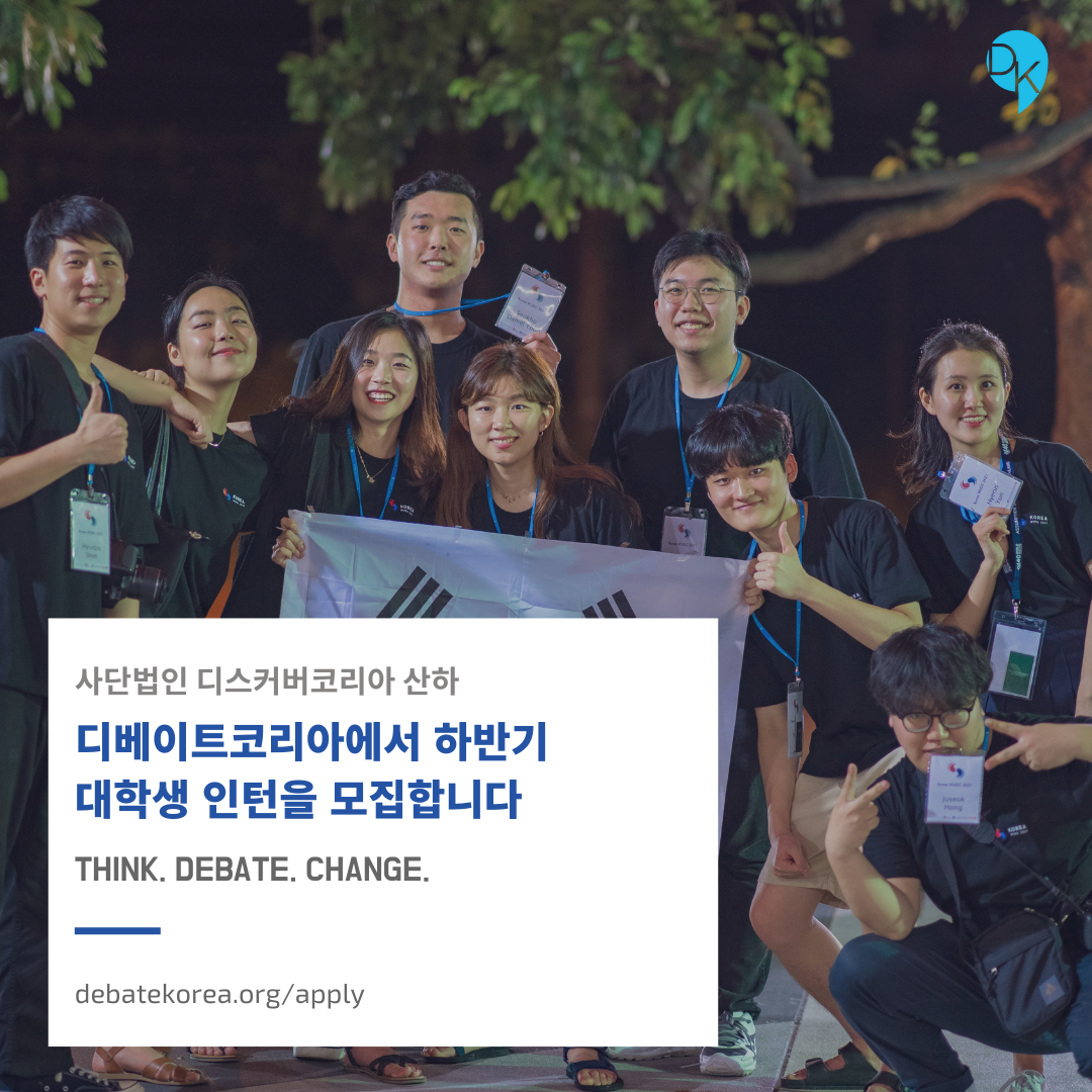 ✔️ 비영리단체 디베이트코리아는 사단법인 디스커버코리아의 산하 단체입니다. 함께 앞선 생각을 가진 리더들이 서로 대화하는 열린 공동체를 만들기 위해 노력하고 있습니다.