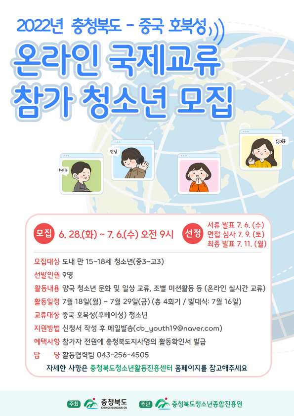 충청북도청소년종합진흥원 청소년활동진흥센터에서는 국가 간 우의 증진과 청소년 글로벌역량 강화를 위하여 충청북도가 주최하고 충청북도청소년종합진흥원이 주관하는 충청북도-중국(호북성) 온라인 국제교류 활동에 참가할 청소년을 모집하오니 많은 관심과 참여 바랍니다.