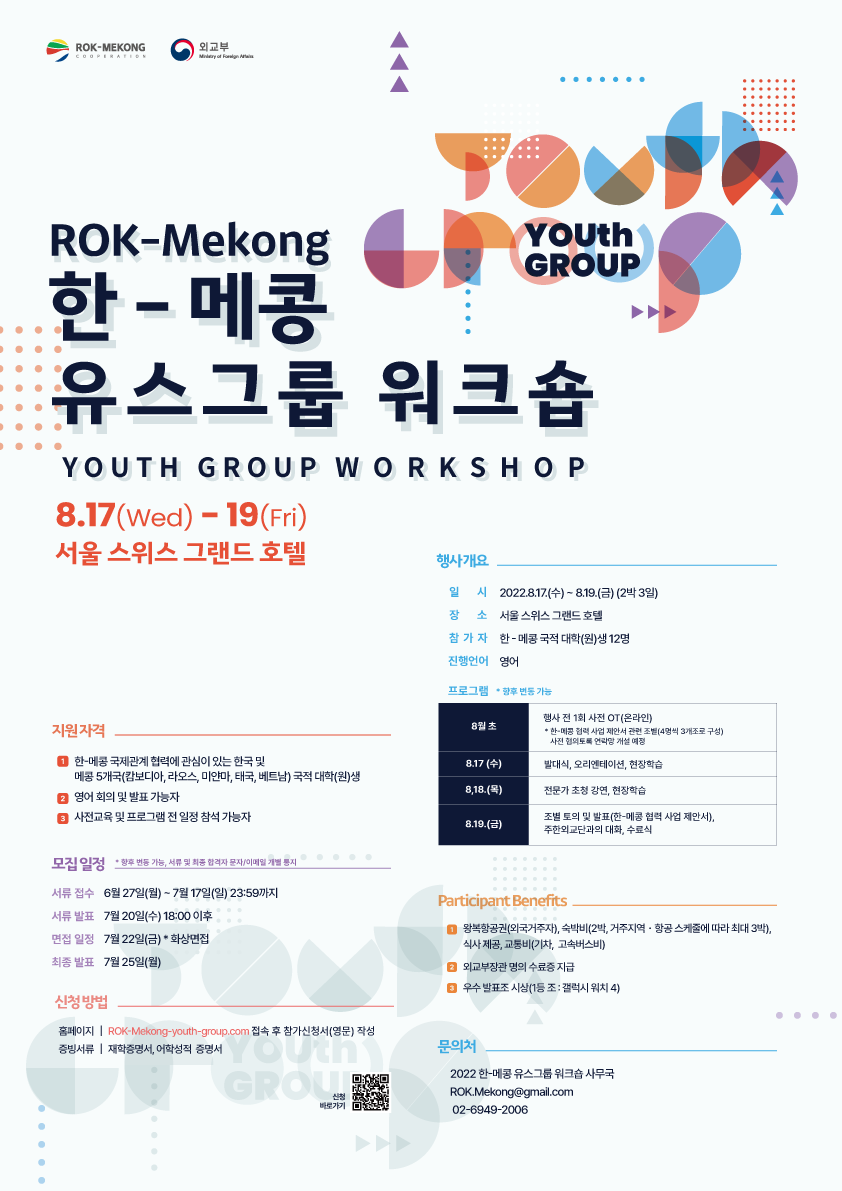외교부와 함께 하는 한-메콩 교류의 해 기념 메콩지역 청년들대상으로 진행되는 한-메콩 유스그룹 워크숍이 8월 17일부터 19일 까지 서울 스위스 그랜드 호텔에서 진행됩니다.