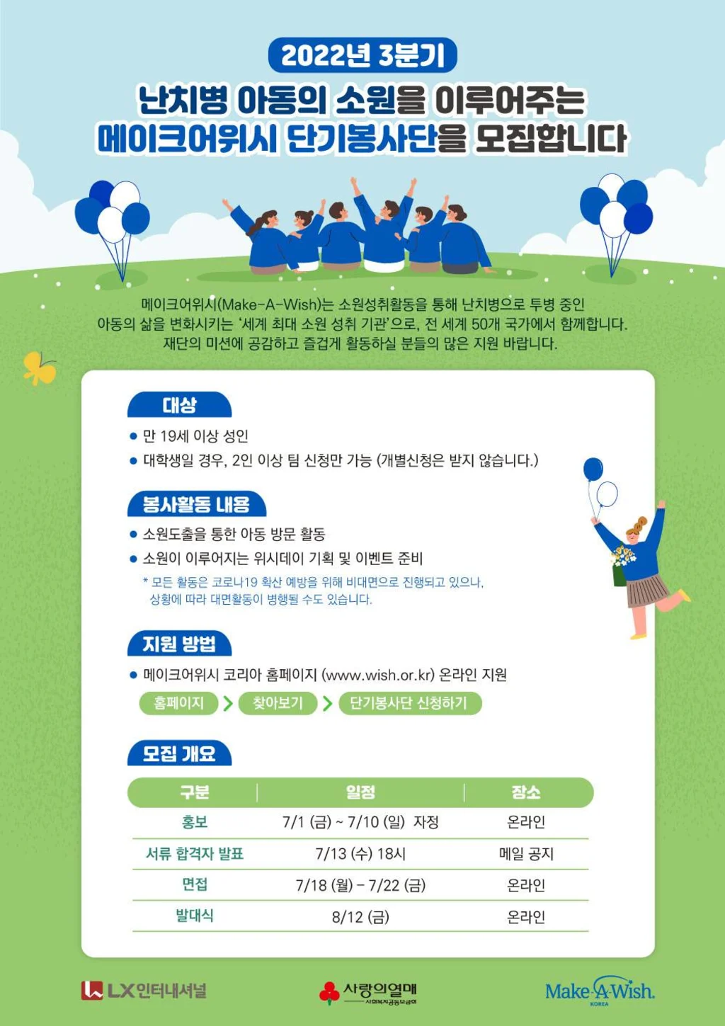 메이크어위시(Make-A-Wish)는 소원성취활동을 통해 난치병으로 투병 중인 아동의 삶을 변화시키는 ‘세계 최대 소원 성취 기관’으로, 전 세계 50개 국가에서 함께합니다. 재단의 미션에 공감하고 즐겁게 활동하실 분들의 많은 지원 바랍니다.