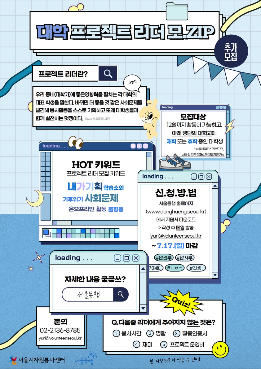 - 서울시자원봉사센터 청년사업팀 기유리 주임 02-2136-8785 / yuri@volunteer.seoul.kr