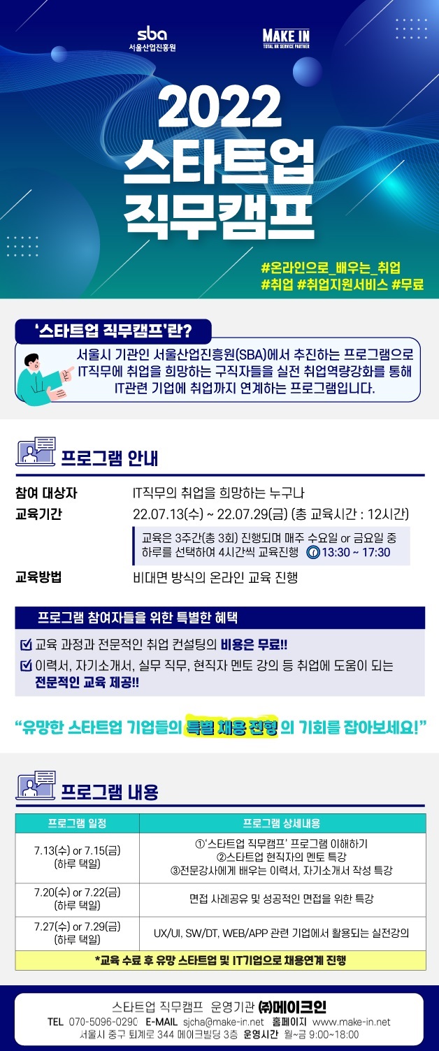 - 서울시 기관인 서울산업진흥원(SBA)에서 추진하는 프로그램으로 IT직무에 취업을 희망하는 구직자들을 실전 취업역량강화를