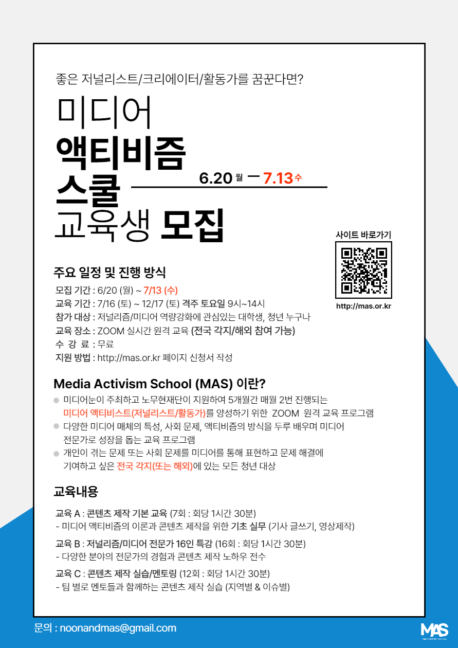 미디어눈에서 기획하고 노무현재단이 지원하는 '미디어 액티비즘 스쿨’ 교육생을 모집합니다.