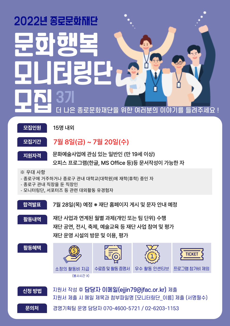 ‘문화행복 모니터링단(3기)’는 종로문화재단에서 추진하고 있는 사업 및 운영시설에 대한 고객 참여기회를 확대하고, 고객의 참신한 아이디어와 경영제언을 바탕으로 재단 경영전반에 반영함으로써 문화행복을 제고하는 문화예술소통 프로젝트입니다.