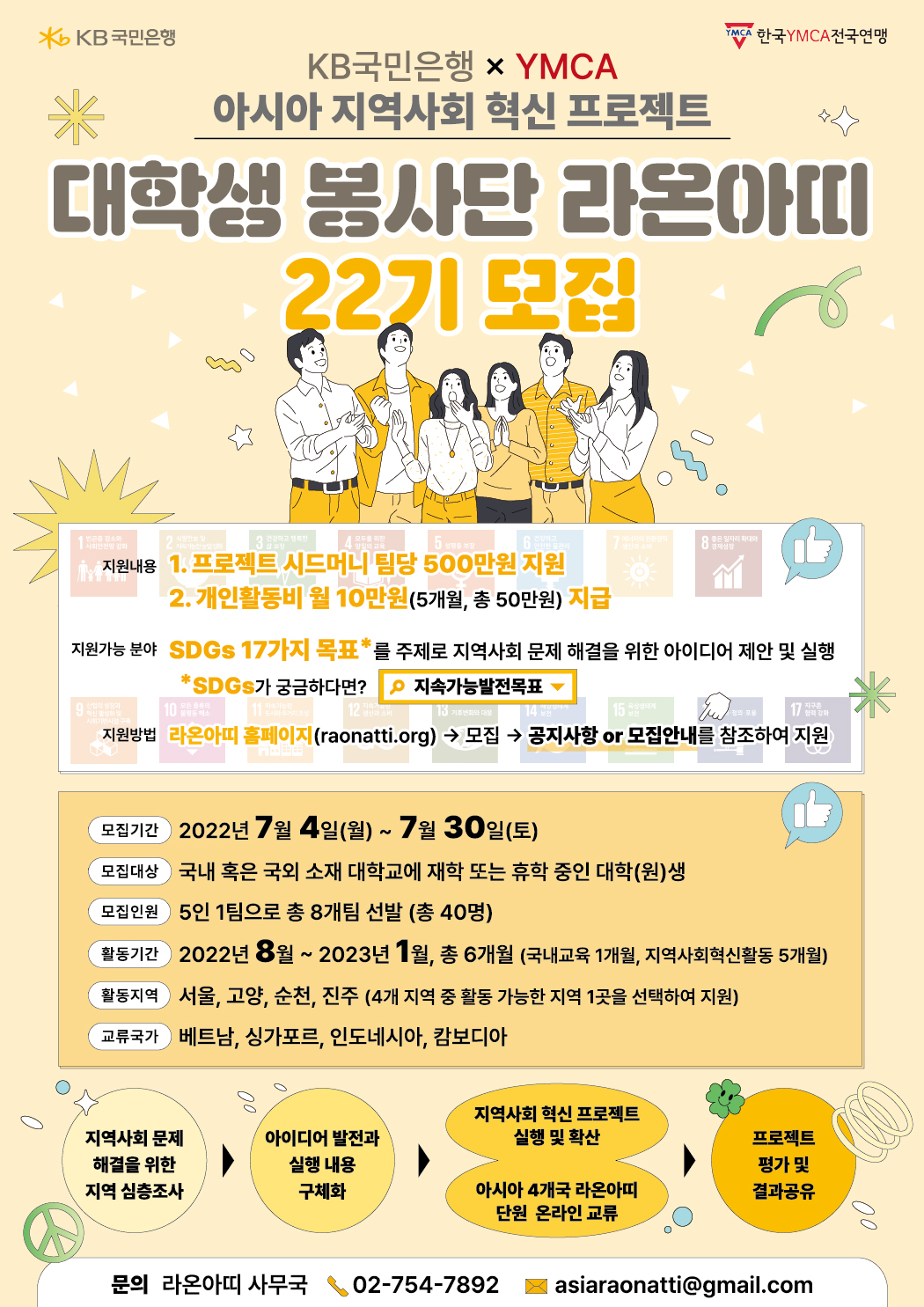 KB국민은행과 한국YMCA전국연맹은 2022년 아시아 지역사회 혁신을 위한 국제사회 대학생 봉사단 라온아띠와 함께할 단원을 다음과 같이 모집합니다.