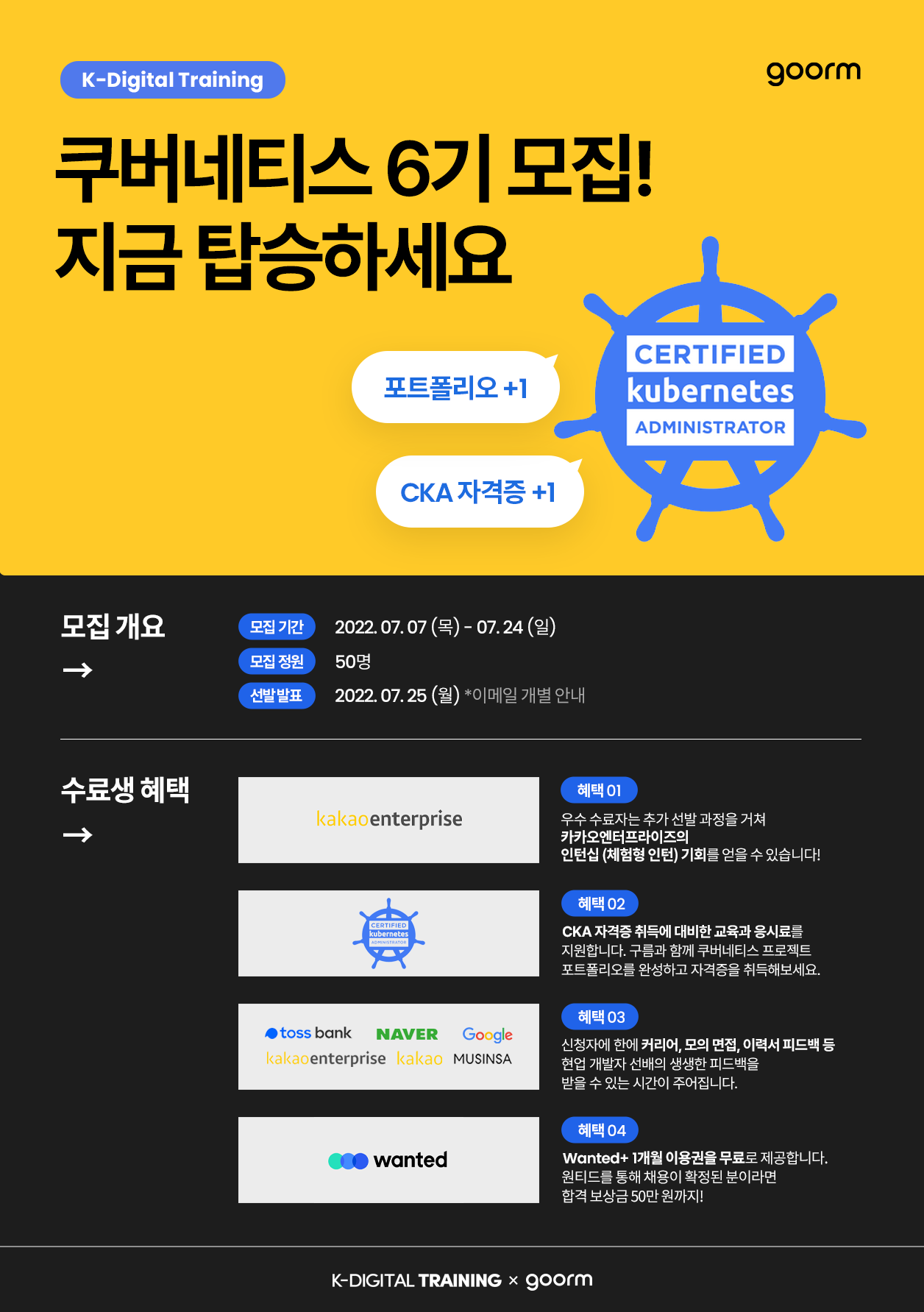 쿠버네티스 교육 과정에는 카카오엔터프라이즈, AI 자연어 처리 교육 과정에는 카이스트 AI 대학원 주재걸 교수 연구실이 참여합니다. (쿠버네티스 과정의 경우 k-digital 교육기관 중 구름이 유일하게 제공합니다)