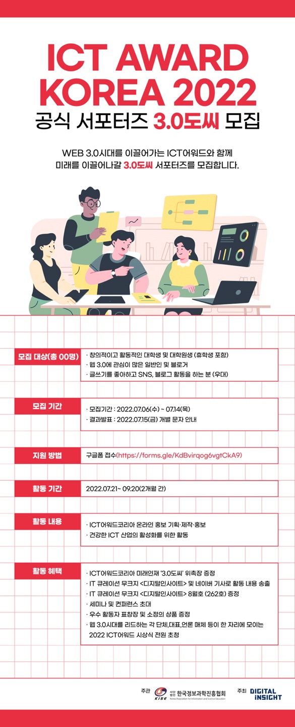 WEB 3.0시대를 이끌어가는 ICT어워드와 함께 미래를 이끌어나갈 '3.0도씨' 서포터즈를 모집합니다.