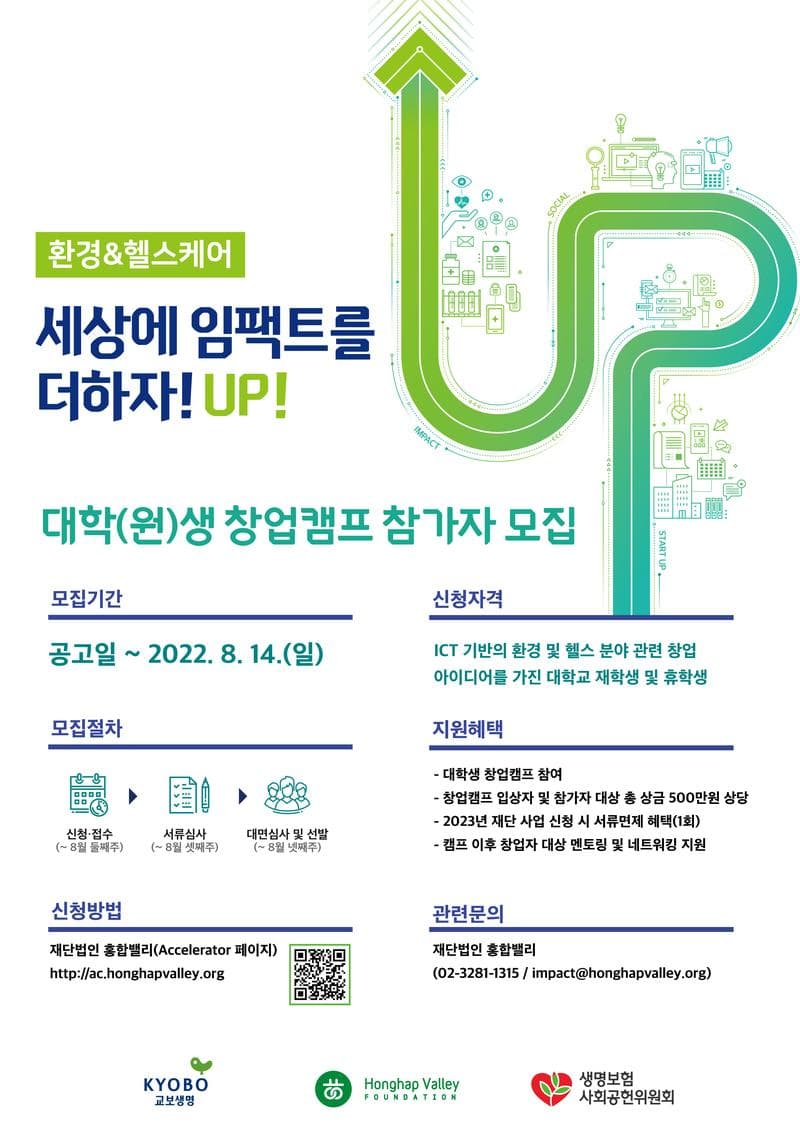 교보생명, 재단법인 홍합밸리, 생명보험사회공헌위원회가 함께 '2022년 세상에 임팩트를 더하자! UP!' 대학(원)생 창업캠프 참여자를 모집합니다!