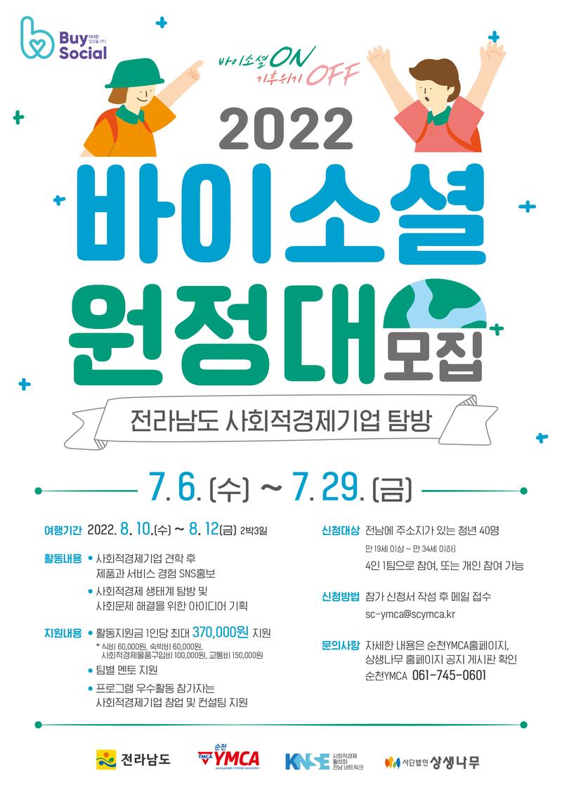 청년들이 사회적경제에 진입하고 사회적경제 기업들을 방문하여 홍보하고 지역의 문제를 해결하기 위한 창업아이디어를 발굴하기 위한 『2022 바이소셜 원정대』에 참여할 청년 및 청년 창업 희망자들을 아래와 같이 모집하오니, 많은 관심과 참여를 바랍니다.