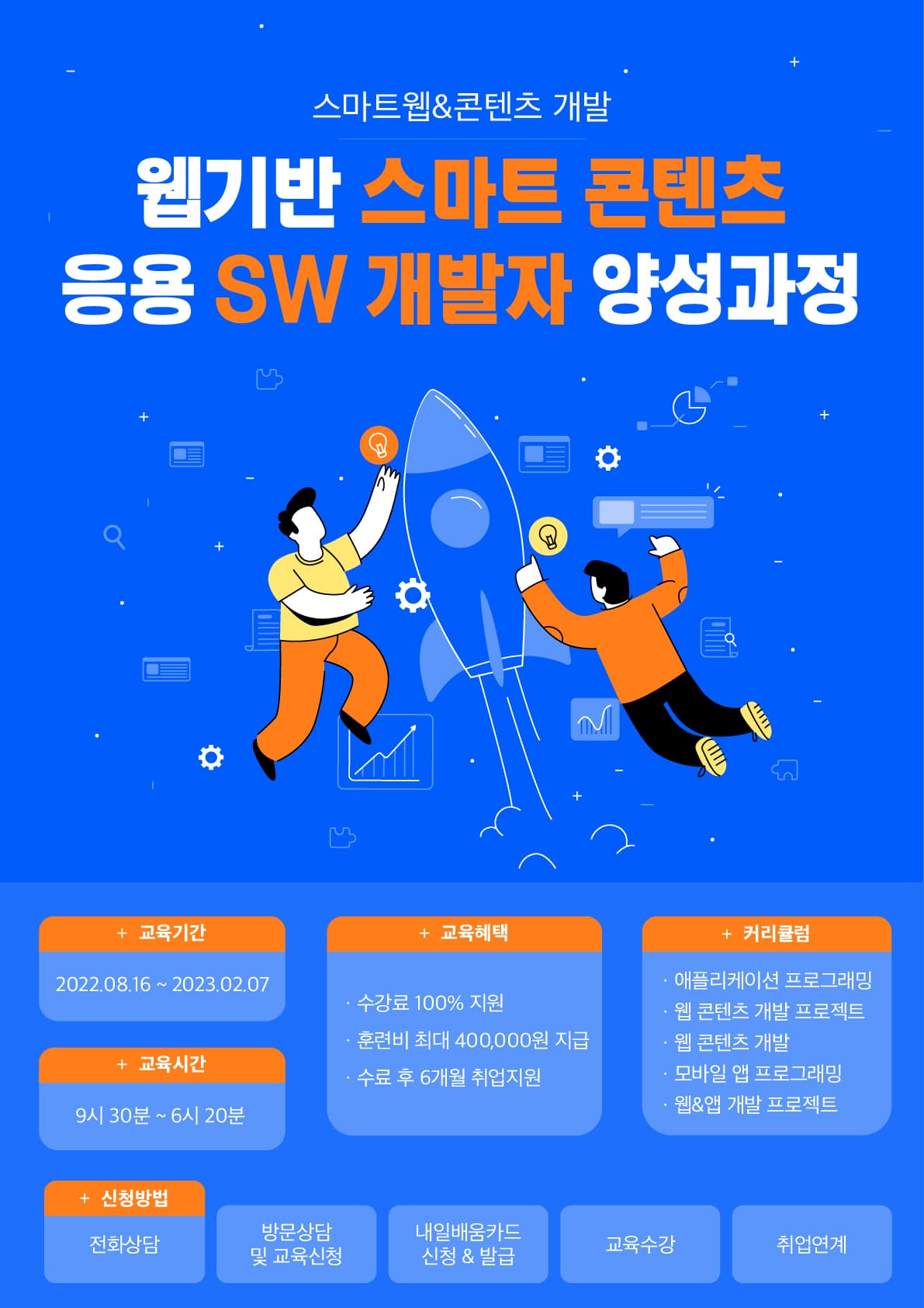 본 과정은 문화 컨텐츠 산업 활성화를 위하여 스마트기기에 적합한 문화콘텐츠를 발굴하여 기획 제작하는 능력을 배양함과 동시에 서버프로그래밍 능력을 배양하여 IT 시장에서 필요로하는 인재를 양성합니다.