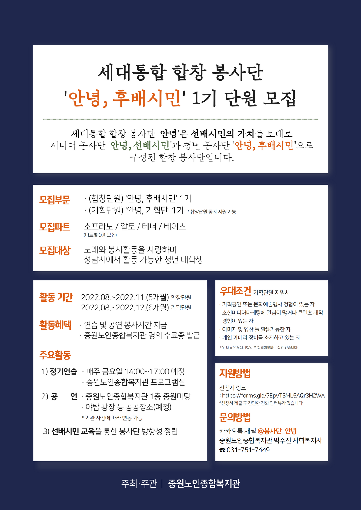 세대통합 합창 봉사단 안녕은 시니어 봉사단 '안녕, 선배시민'과 청년 봉사단 '안녕, 후배시민'으로 구성된 중원노인종합복지관 소속 봉사단입니다.