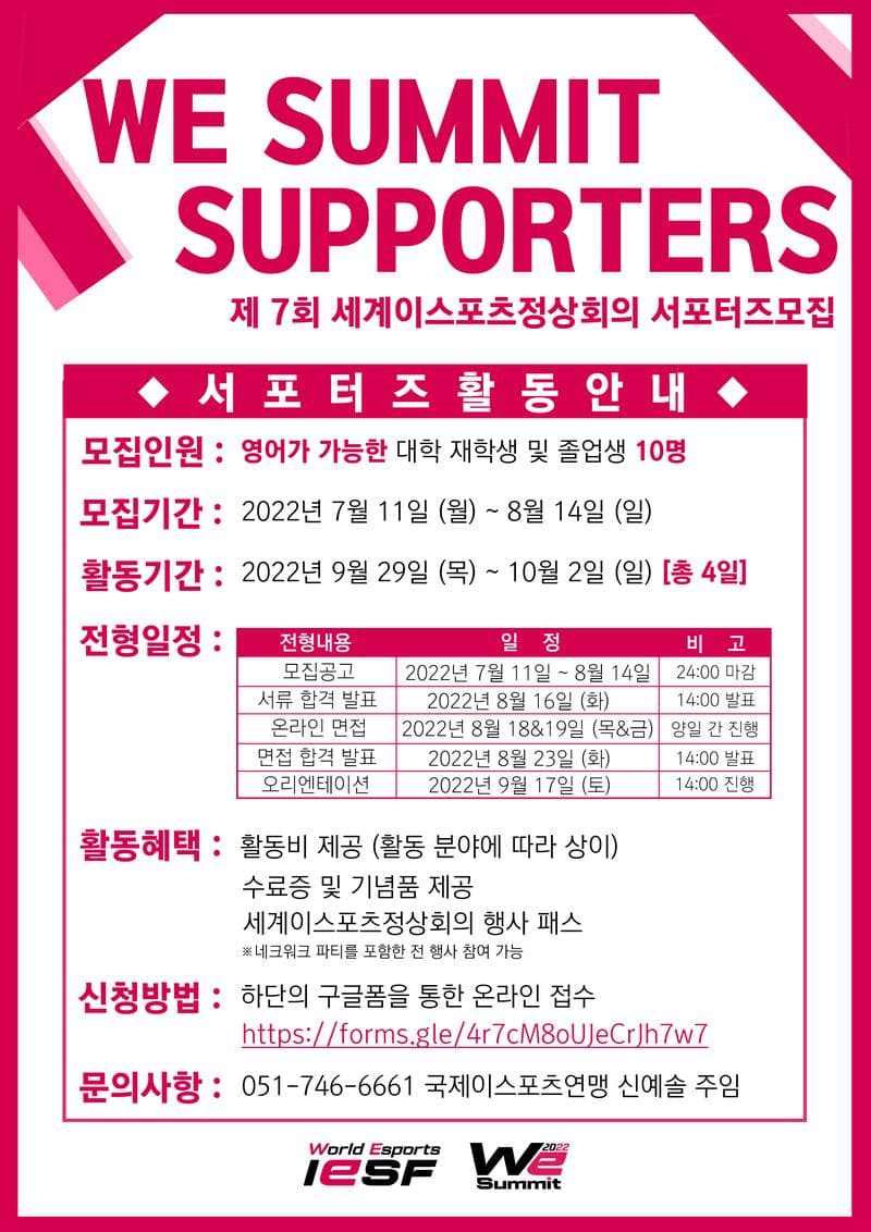 세계이스포츠정상회의(World Esports Summit, WE Summit 22)은 게임사, 이스포츠 최정상 관계자 등 다양한 현직 이스포츠 전문가들과 네트워킹 및 이스포츠 산업 발전에 대한 토론을 나누는 장입니다. 금해 7회를 맞이하며 새로운 브랜딩과 함께 제 1기 서포터즈를 모집하게 되었으니 많은 지원 부탁드립니다!