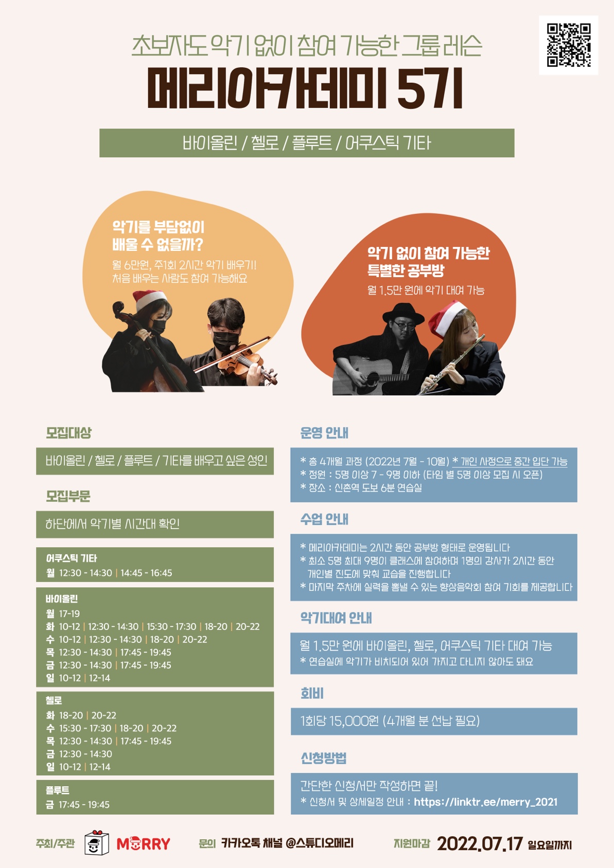 📌모집대상 : 바이올린/첼로/어쿠스틱 기타를 배우고 싶은 성인 누구나 (초심자 환영 & 악기 대여 가능)
