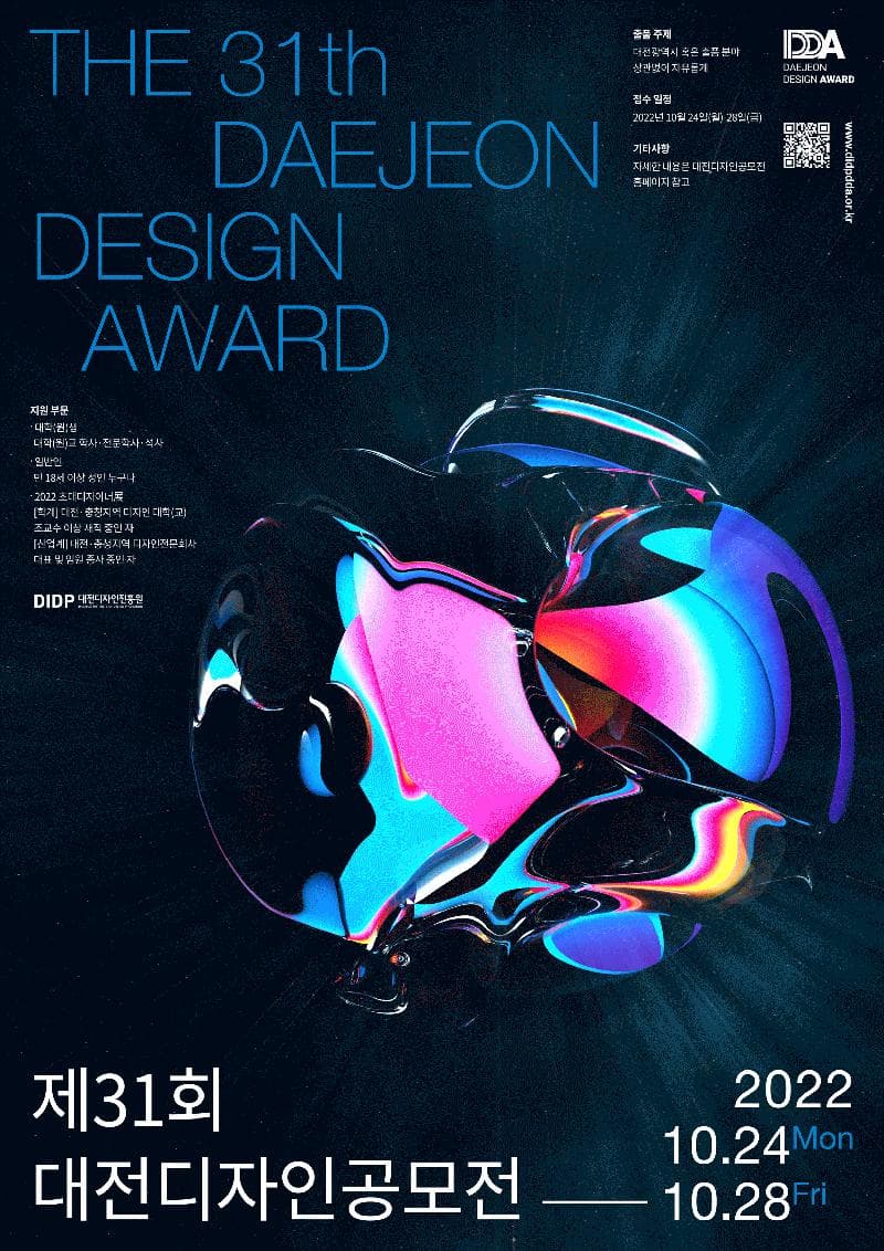 (재)대전디자인진흥원에서는 지역의 디자인 수준 향상을 도모하고 미래의 역량 있는 신진 디자이너 발굴 및 중견 디자이너들의 자긍심 고취를 위해 ‘제31회 대전디자인공모전’을 개최하고자 합니다. 대한민국을 대표하는 디자이너, 학생 여러분들의 많은 관심과 참여를 부탁드립니다.