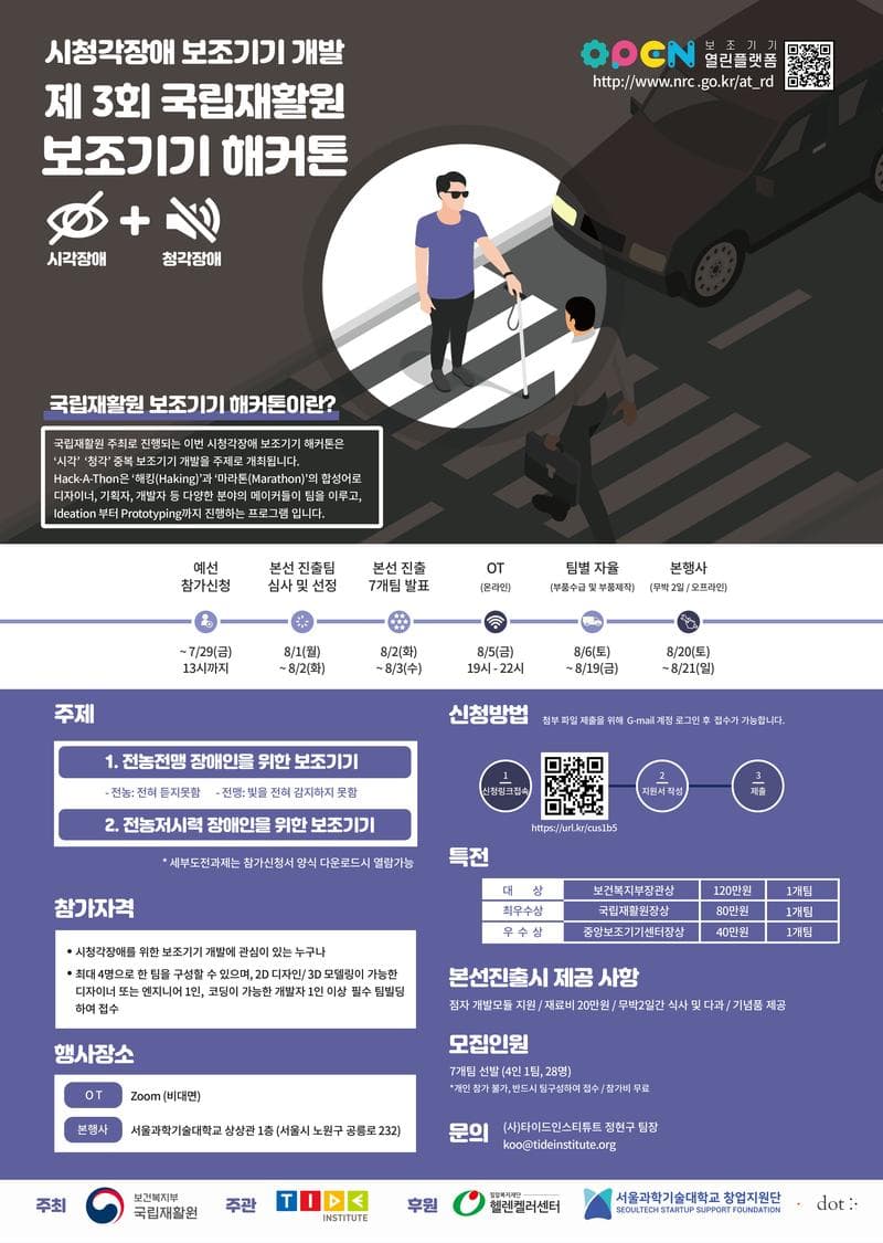 국립재활원 주최로 진행되는 이번 제3회 국립재활원 보조기기 해커톤은 "시청각장애 보조기기 개발"을 주제로 개최됩니다.