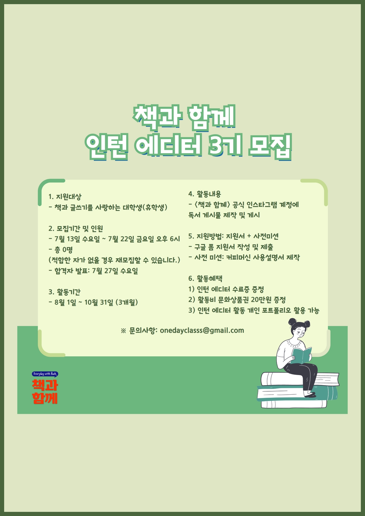 3개월 간 <책과 함께> 인스타그램 인턴 에디터로서 활동할 수 있습니다.
