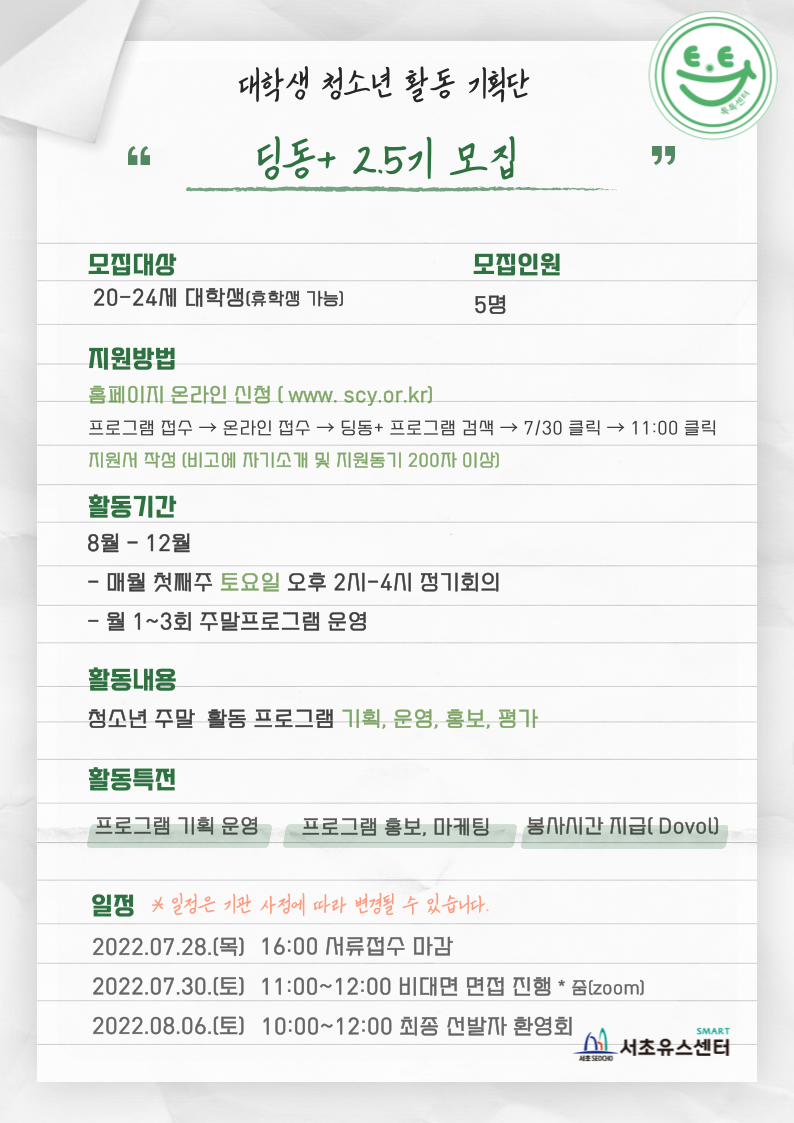 ✔ 지원방법: 서초유스센터 홈페이지 -> 프로그램 접수 -> 온라인 접수 -> 딩동+ 프로그램 검색 -> 지원서 작성(비고에 200자 이상 자기소개 작성)