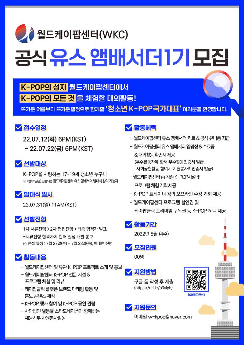 월드케이팝센터 공식 유스 앰배서더 1기를 모집합니다🙆♀️🙆♂️