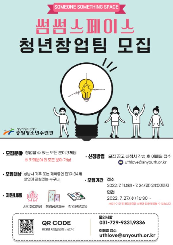 - 성남시청소년재단 중원청소년수련관은 청년 창업 프로젝트[썸썸스페이스]를 통해 창업공간 구성, 창업 사업화 지원(시제품 제작 및 재료비), 컨설팅(교육, 멘토링, 네트워킹 등)을 지원