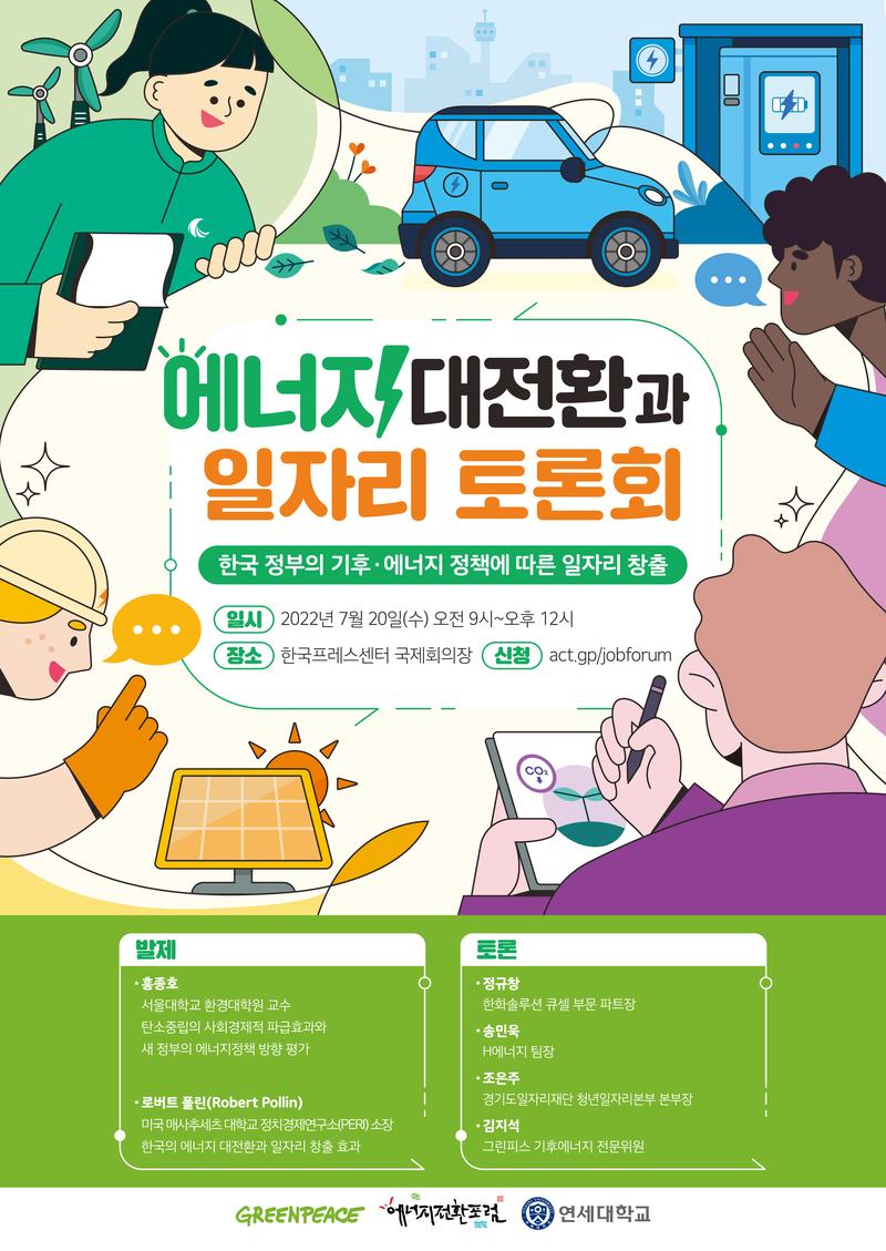 그린피스 서울사무소는 에너지전환포럼, 연세대학교와 함께 '에너지 대전환과 일자리 토론회'를 개최합니다.