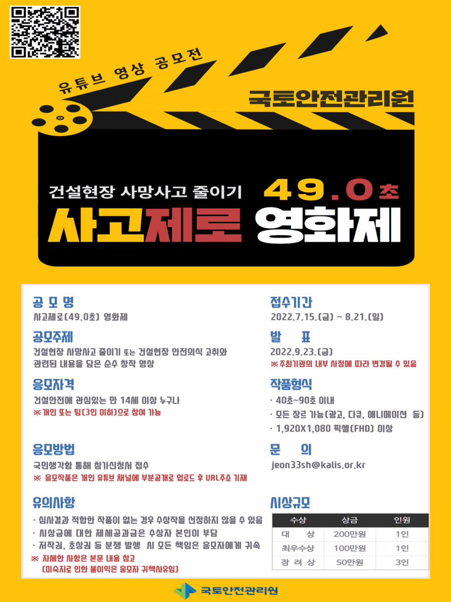 국토안전관리원에서 유튜브 영상 공모전을 실시합니다. 건설안전과 관련된 숏폼 영상을 자유롭게 제작해주세요!