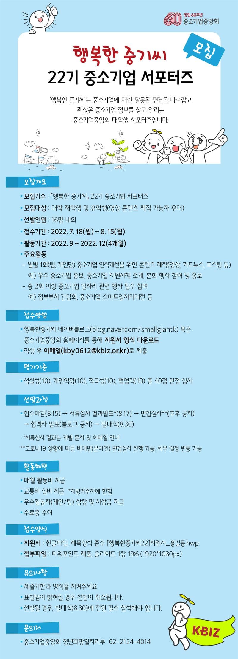 올해 하반기 중소기업중앙회외 함께할 '행복한 중기씨' 22기 중소기업 서포터즈를 모집합니다.