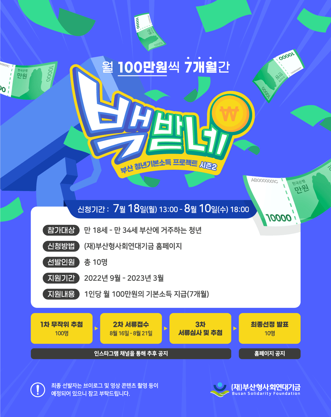부산형사회연대기금은 기본소득을 통한 부산 청년들의 삶의 질 변화 관찰 및 기본소득 사례 연구를 위해 부산 청년기본소득 프로젝트 시즌2 "백받네" 사업을 실시합니다.