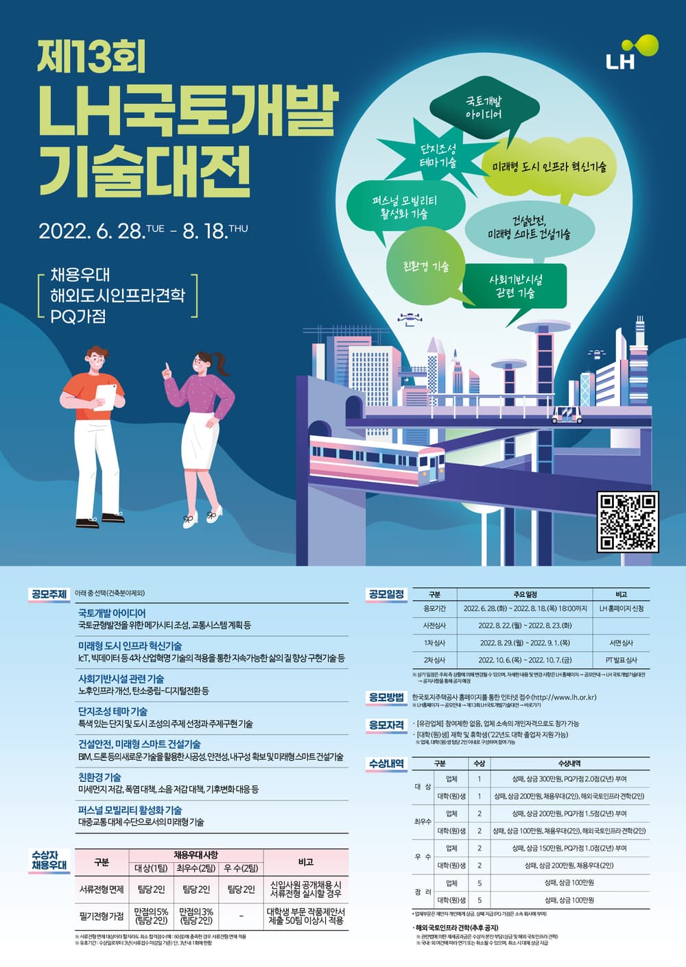 건설 분야의 창의적이고 혁신적인 국토개발 기술을 발굴하고 친환경·미래 지향적인 도시건설의 방향성 제시를 위해 유관업체 및 대학(원)생을 대상으로 제13회 LH 국토개발기술대전 개최