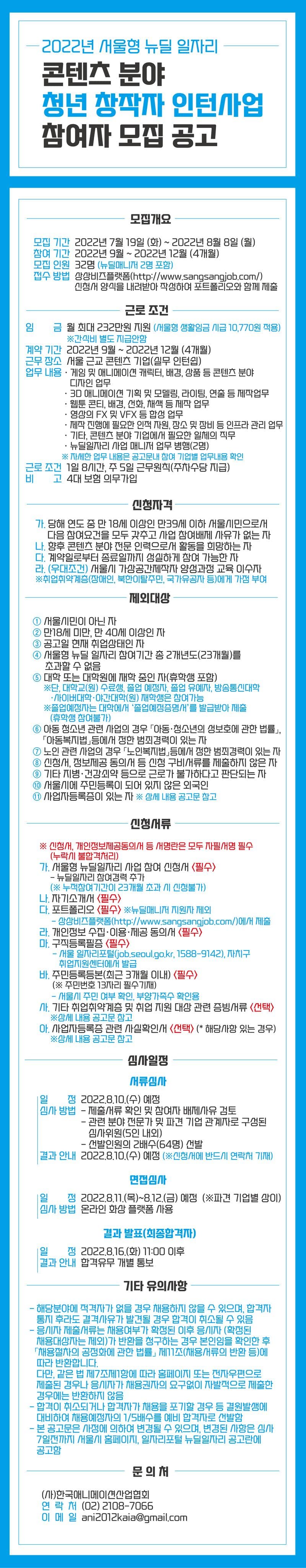 2022년 서울형 뉴딜일자리 : 콘텐츠분야 청년창작자 인턴사업 참여자 모집