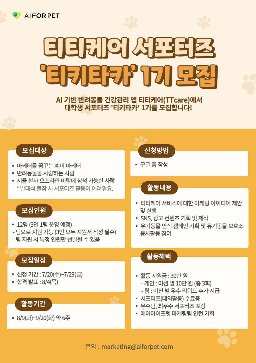 대학생 서포터즈 '티키타카' 1기를 모집합니다! 🐶🐱