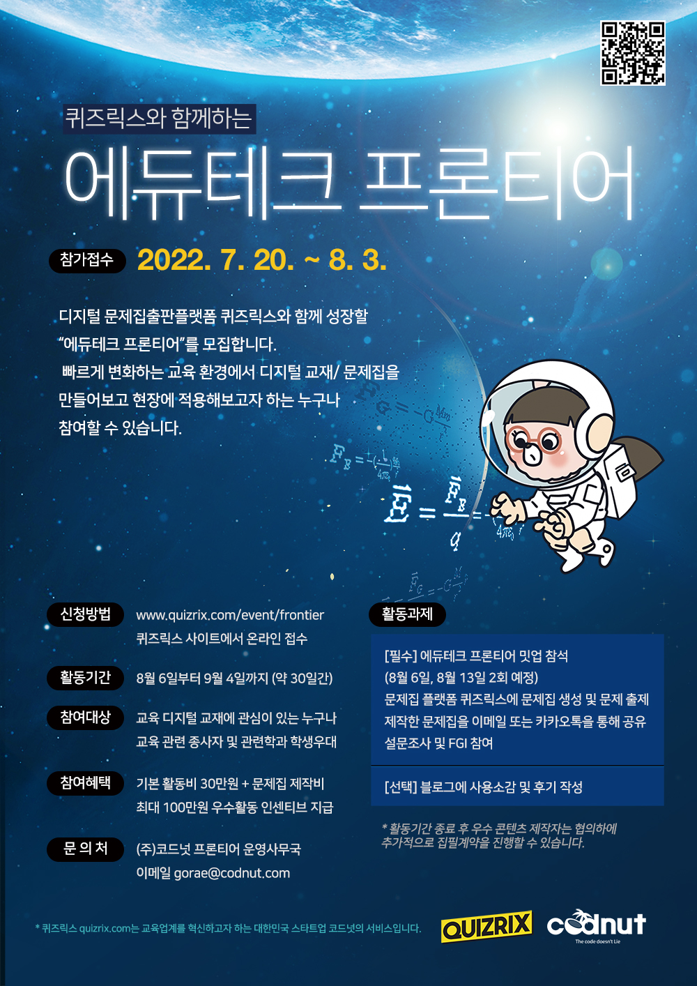 디지털 문제집출판플랫폼 퀴즈릭스와 함께 성장할 “에듀테크 프론티어”를 모집합니다. “에듀테크 프론티어”는 빠르게 변화하는 교육환경에서 디지털 교재/문제집을 만들어보고 현장에 적용해보고자 하는 누구나 참여할 수 있습니다. 퀴즈릭스 quizrix.com 는 교육업계를 혁신하고자 하는 대한민국 스타트업 코드넛의 서비스입니다.