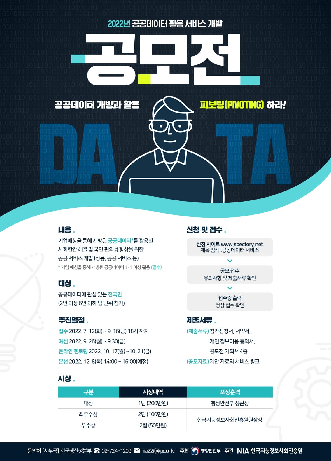 - 공공데이터에 관심 있는 전국민(2인 이상 6인 이하 팀 단위 참가)