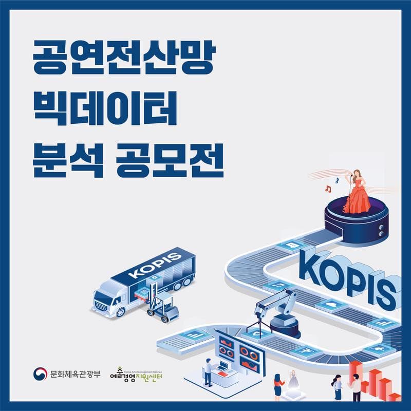 KOPIS 빅데이터 분석 공모전은 공연 전산망 및 외부데이터 결합을 통해 혁신적 분석 결과 및 모형을 도출해 내어, 공연시장 활성화 및 고도화에 기여할 수 있는 창의적 아이디어를 지닌 전 국민을 대상으로 진행하는 공모전입니다.