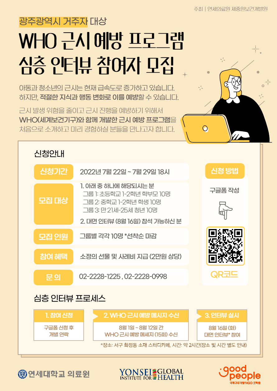 -연세의료원 제중원보건개발원은 WHO(세계보건기구)와 함께 근시 발생 위험을 줄이고 근시 진행 예방을 위해서 개발한 근시 예방 프로그램을 처음으로 소개하고, 참여 경험을 파악하고자 합니다.